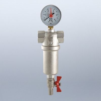 предназначен для очистки воды с возможностью удаления накопившихся загрязнений без извлечения сетчатых вставок (промывной фильтр). Оснащен двумя (один в другом) фильтроэлементами из нержавеющей стали. Размер ячеек сетки первичного фильтроэлемента – 1000, вторичного – 250 мкм. Корпус и колба фильтра выполнены из латуни марки CW617N (европейский стандарт EN 12165), никелированы. Предусмотрены дренажный шаровой кран со штуцером для подключения шланга и манометр для контроля уровня загрязненности сеток. Фильтр монтируется в вертикальном положении, колбой вниз. Резьба присоединений – внутренняя.