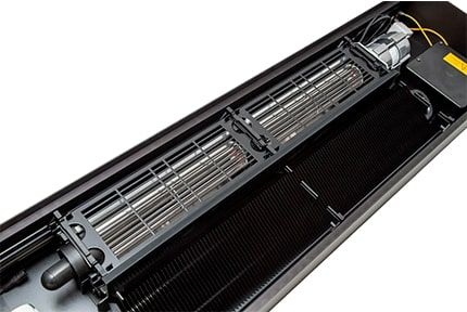 Продувает воздух по всей длине теплообменника, увеличивая максимальную мощность прибора более, чем в 5 раз. В длинных приборах валы вентилятора соединяются специальной муфтой.