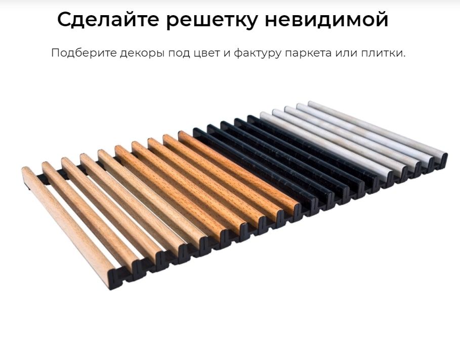 По желанию заказчика решетку можно покрасить в любой RAL цвет или заказать DECOR-исполнение, которое повторяет фактуру деревянного пола или плитки.