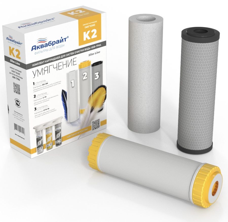Комплект картриджей УМЯГЧЕНИЕ К-2 Аквабрайт устанавливается в фильтры стандарта Слим Лайн, высота колбы фильтра 254 мм, под кухонную мойку и предназначен для трехступенчатой очистки питьевой воды