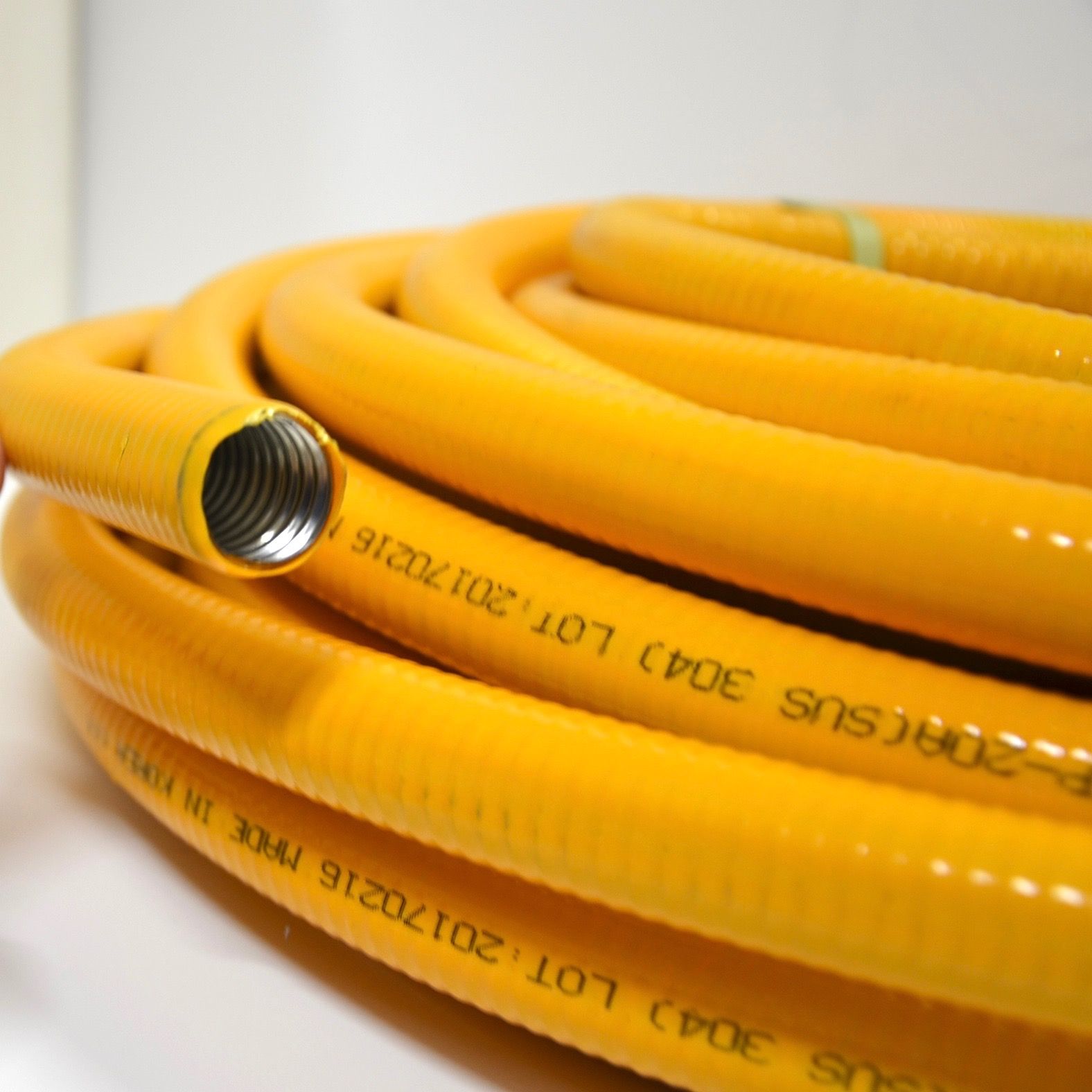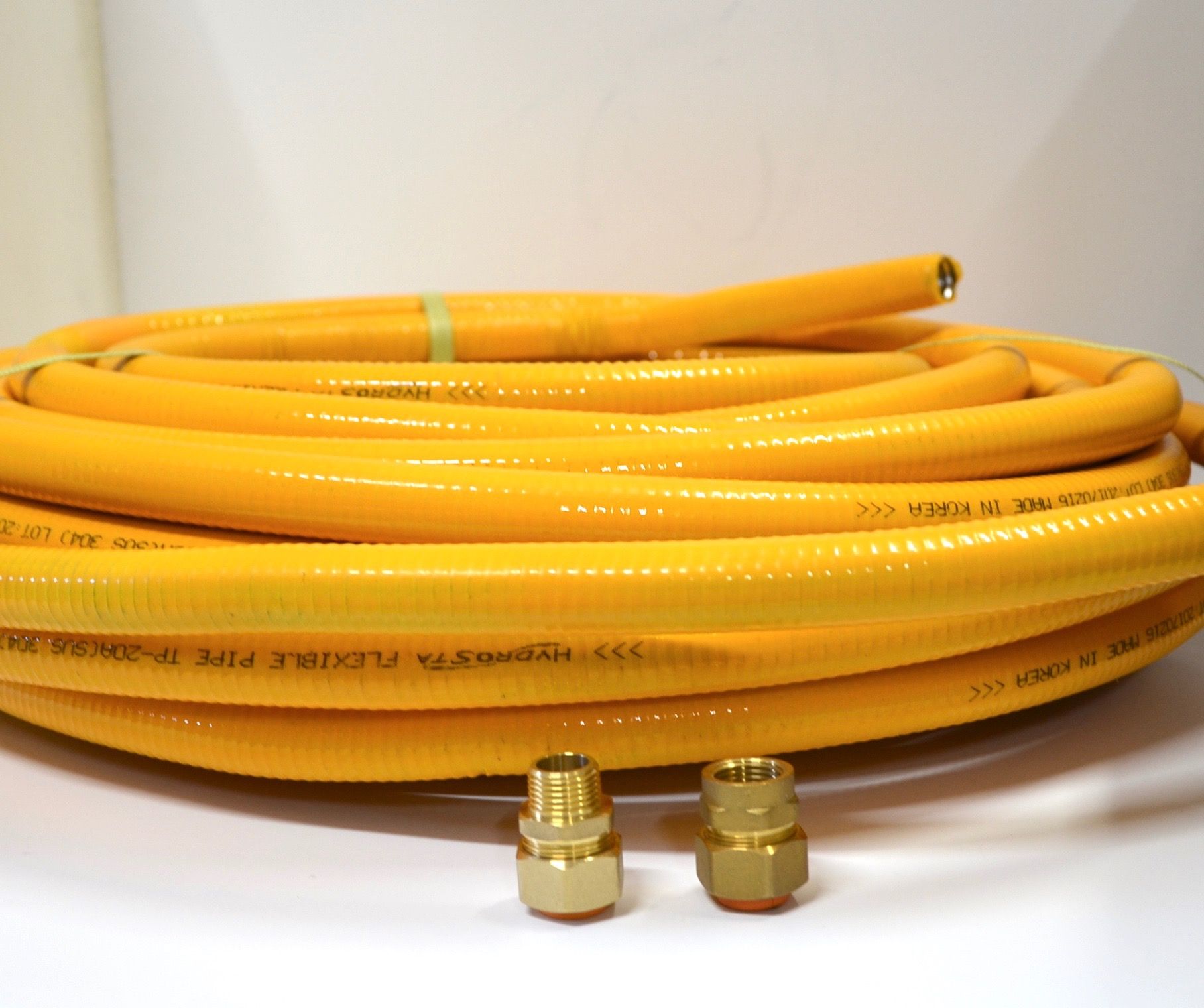 Для изготовления гибкой газовой подводки используются нержавеющие гофрированные трубы из нержавеющей стали марки SUS304. Гибкая нержавеющая труба имеет полиэтиленовое покрытие желтого цвета. Для систем внутреннего газораспределения используются гофрированные нержавеющие трубы диаметром 15 миллиметров и 20 миллиметров. |