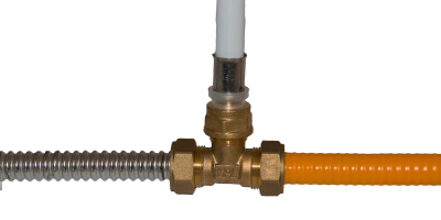 Производится отвод несущей среды из трубопровода, в котором использована гофрированная труба из нержавеющей стали, в трубопровод, изготовленный из других материалов (металлопластиковые, медные, полипропиленовые, стальные) под углом 90о с использованием наружной резьбы.