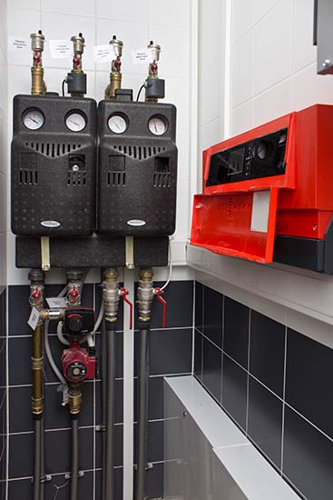 Контроль над работой насосов выполняется по сигналу датчиков перепада давления, установленных на каждом насосе. В систему автоматизации входят датчики температуры — погружные для теплоносителя и наружные для определения температуры воздуха.