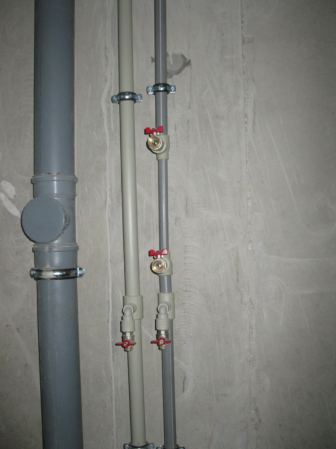 На приведенных ниже снимках пример комплексного решения реализованного на 17-и этажном жилом доме в г. Ивантеевке по ул. Студенческий пр-д, д 3. Укомплектованы системы ГВС и ХВС в техподполье (фото 1) , стояки (фото 2) и техчердак (фото 3) здания. Смонтированы и успешно эксплуатируются все типы выпускаемых заводом полипропиленовых труб диаметром от 20 мм до 110 мм.
