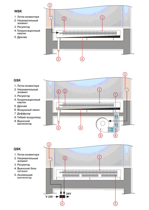 При проектировании конвекторов в бассейнах нужно учитывать на каком расстоянии от чаши бассейна они будут располагаться. Это связано с вероятностью затопления конвектора и как следствие с выбором используемого типа. Конвектора WSK и GSK могут подвергаться полному затоплению, QSK нет. Вся регулировочная техника в бассейнах и помещениях с повышенной влажностью используется с напряжением 24 V, то есть с напряжением безопасным для жизни человека.