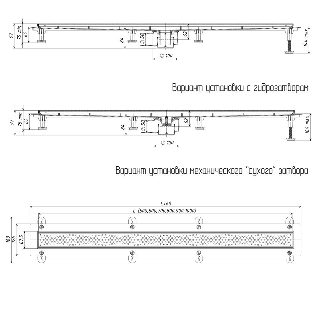Линейные трапы 1 с горизонтальным выходом предназначены для сбора и отведения жидкости в канализацию с поверхности пола. Монтируется в ванных комнатах и душевых, санузлах квартир и загородных домов, общественных местах.