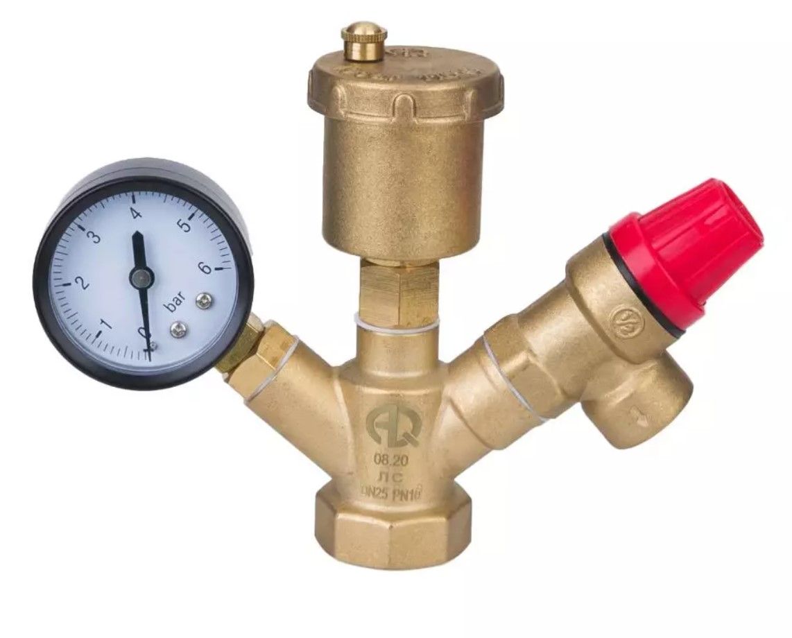Изделие оснащено автоматическим воздухоотводчиком, предохранительным клапаном (с неизменяемым и предустановленным значением открытия) и манометром.